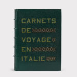 DENIS (Maurice). Carnets de voyage en Italie. 1921-1922 . Paris, Jacques Beltrand, 1925. Fort volume in-4°, maroquin vert, large titre et bouts-de-lignes mosaiqués avec filets dorés ornant le premier plat, dos à nerfs muet, tranches dorées sur témoins, doublures de maroquin brun, gardes de soie moirée noire, couvertures et dos conservés, chemise à rabats en demi-maroquin vert, étui (Canape et Corriez - 1929) .