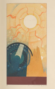 [MARDRUS (Jacques Charles) & SCHMIED (François Louis)]. La Création. Les Trois premiers livres de la Genèse suivis de la Généalogie adamique. Traduction littérale des textes sémitiques par M. le Docteur J.-C. M ardrus . Préface de M. le Professeur H. R oger . Paris, F.-L. Schmied, 1928. Grand in-4°, maroquin noir, large décor personnalisé dorés, au palladium et à froid rayonnant autour de deux triangles de cuivr e superposés, l'un laqué, ornant le premier plat, dos lisse orné du titre, doublure de box orange, la première ornée d’une aquarelle originale signée de Schmied, g ardes de moire orangée e t d'argent, tranches dorées, couverture illustrée en couleurs conservée, chemise demi- maroqu in noir et étui recouvert ( Darcey ) .