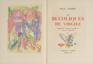 VALÉRY (Paul). Les Bucoliques de Virgile . Paris, Scripta & Picta, 1953. In-4°, maroquin tricolore bleu-vert, bleu et violet, large décor personnalisé en box mosaïqué et filets dorés ornant les plats, dos lisse orné du titre doré sur bande de box violet, tranches dorées sur témoin, doublure et gardes de daim bleu, couverture et dos conservés, chemise à petits recouvrements en demi-maroquin noir, étui (Creuzevault) .