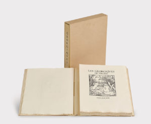 VIRGILE. Les Géorgiques . Texte latin et version française de l'abbé Jacques Delille . Préfaces par André Mary & J ean Giono . Paris, Philippe Gonin, Éditeur, 1937-1943/1950. 2 volumes in-4° en feuilles, sous couvertures rempliées, chemises et étuis de l'éditeur.