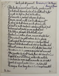 in-4 monté sur onglets de 13 ff., reliure de l’époque maroquin janséniste vieux rouge, dos à nerfs, cadre intérieur de maroquin rouge avec filets dorés et à froid et fleurons mosaïqués aux angles, doublures et gardes de soie brochée vert et or (Marius Michel).Réunion des manuscrits originaux, complets, des 13 poèmes des Portes de la Ville.