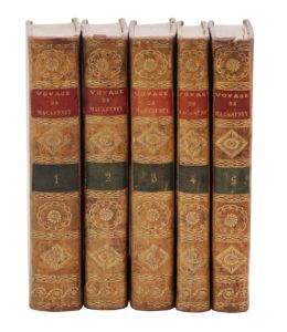 Paris, F. Buisson, an VI – 1798. 5 volumes in-8, veau raciné, dos lisse orné, tranches jonquille (Reliure de l'époque).Première édition française, traduite par Jean Castéra, augmentée de l'ensemble des additions de la seconde édition, parue un an plus tard, réunies dans un cinquième volume : un Précis de l’histoire de la Chine dû au traducteur et la traduction du Voyage en Chine et en Tartarie de Johann Christian Hüttner.