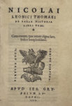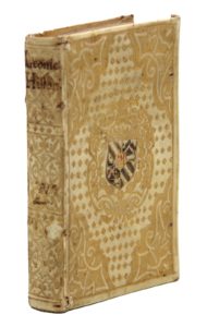 Lyon, Sébastien Gryphe, 1555 ; in-16, vélin doré souple à recouvrement de la fin du XVIe siècle, plats très richement décorés avec larges écoinçons dorés aux angles, semis de fleurs de lys, armes peintes au centre dans un médaillon doré, dos lisse et rabats des plats très ornés, titre à l’encre, tranches dorées et antiquées, traces d’attaches. Jolie réimpression en caractères italiques de l’édition parue en 1532 chez le même éditeur. L’auteur, professeur de philosophie à Padoue, offre des récits sur divers personnages de la Grèce antique.