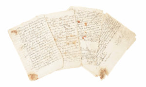MILHAUD - Abraham de Milhau. — Procès contre Abraham de Milhau. — 5 pièces manuscrites dont 2 signées de Jacques de Sacratus, évêque de Carpentras, et 1 de Guillaume Cheysolm, évêque de Vaison (Nonce à Paris, écossais, qui fut dans sа...