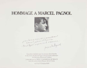 [PAGNOL] — Un livret d’exposition relatif à l’exposition en hommage à “Marcel Pagnol” à la Maison de la Chimie à Paris, 1979. — Enrichi d’un envoi signé de Jacqueline Pagnol.