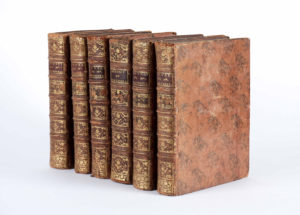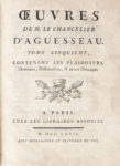 D’AGUESSEAU - Œuvres de M. Le Chancelier d’Aguesseau, chez les Libraires associés, Paris 1759 - 1769 — 6 vol. in-4, reliures plein cuir marbré marron, dos ornés de motifs floraux, 5 nerfs, pièces de titres et tomaisons.