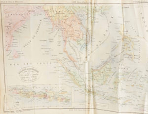 “Java, Siam, Canton”, par Le Comte de BEAUVOIR, 1871 — In-8 à demi-reliure de cuir vert, 5ème édition, Henri Plon Imprimeur-Éditeur. — Livre enrichi d’une “carte spéciale” de Malaisie et Indochine en couleur (30 x 37 cm -...