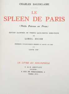 Le Spleen de Paris. Petits Poèmes en Prose. Charles BAUDELAIRE, édition Le Livre du Bibliophile, Paris, 1921 — Grand in-4, demi-reliure cuir bordeaux à coins, dos orné à 5 nerfs, pièce de titre dorée.