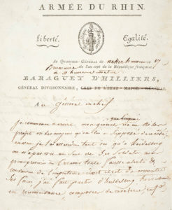 - Armée du Rhin : Baraguey d’Hilliers, lettre signée au Général en Chef Lecourbe, datée du 17 Brumaire An 7. 1 feuillet in 4, vignette.