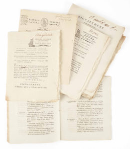 SIGNALEMENTS DE POLICE — Ensemble de 14 pièces imprimées la plupart du XVIIIe avec vignettes révolutionnaires émanant des Commissaires du Directoire Exécutif du département de l’Hérault.