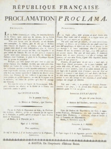 [CORSE] — [BONAPARTE] “République Française - Proclamation / Proclama”,, BONAPARTE, vu par J. PIETRI, Bastia, Imp. Etienne Batini, 8 thermidor An X — Placard in-folio, double colonnes (français / italien), déclaration du premier consul...
