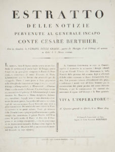 [CORSE] “Estratto delle Notizie pervenute al Generale Incapo Conte Cesare BERTHIER”, Ajaccio, Della Stamperia Imperiale, 10 Marzo 1814 — Placard relatif à la proclamation de propagande lancée au moment de l’effondrement des armées impériales.