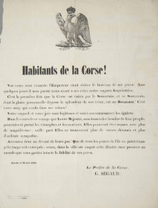 [CORSE] — “Habitants de Corse !”, Ajaccio, Imp. G. Marchi, 25 août 1860 — Placard in-folio, bel en-tête avec aigle impérial couronné. — Proclamation annonçant la venue de Napoléon III et de l'impératrice Eugénie en Corse.