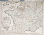 Carte aquarellée sur papier vergé. Beau cartouche. A Paris chez l’Auteur, 1708. Mouillures. Déchirures dans les marges. Dimensions : 49 x 65 cm (plaque) ; 52 x 72,5 cm (feuille).