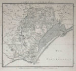 Partie droite d’une carte plus grande. Beau cartouche. Aquarellée sur papier vergé. Pliures, déchirures. Dimensions : 63 x 49 cm (feuille).