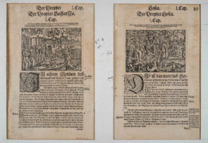 [GRAVURES] — Bible de Luther, c. 1570 — 2 planches gravées issues de la bible de Luther. — Déchirure sur côté d’une gravure. — Dimensions : 36,4 x 24 cm (chaque).