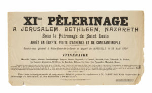Affichette du XIe PÈLERINAGE à JÉRUSALEM sous le patronage de Saint Louis. — Arrêt en Egypte, visite d’Athènes et de Constantinople. — Paris la Semeuse, 1904