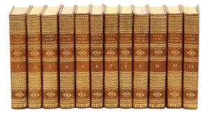 Paris, F. Dufart père, 1808-1809 ; 12 volumes in-8 (200 x 123), basane racinée, dos lisses ornés de treillis et fleurons dorés (Reliures de l'époque). Abrégé des grands voyages de Christophe Colomb, Magellan, Bougainville, Cook, La Pérouse... illustré de 10 portraits, 66 planches figurant des indigènes et 6 grandes cartes rehaussées d'aquarelle.