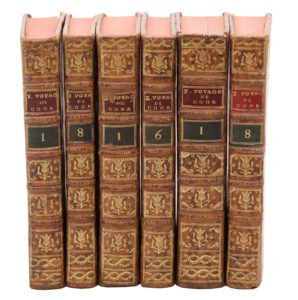 Paris, Saillant et Panckoucke, 1774 ; 8 vol. – (Deuxième voyage). Voyage dans l'hémisphère austral et autour du monde en 1772, 1773, 1774 et 1775. Paris, Hôtel de Thou, 1778 ; 6 vol. ; (Troisième voyage). Troisième voyage de Cook ou Voyage à l'Océan Pacifique... en 1776, 1777, 1778, 1778 et 1780. Ibid., id., 1785 ; 8 vol. Ensemble 22 volumes in-8 (200 x 122 mm) en reliure uniforme, veau marbré, dos à nerfs ornés de fleurons dorés (Reliures de l'époque). Premières éditions in-8 des trois voyages, en jolies reliures uniformes de l'époque. Sans les planches.