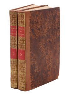 Paris Dentu, an IX-1801 ; 2 vol. in-8 (195 x 125 mm), demi-veau fauve, plats de papier raciné, dos lisses entièrement ornés d'un treillis doré (Reliures de l'époque). ... contenant la description des îles Séchelles... suivi d'un Voyage fait dans la Mer Rouge contenant la description de Moka et du commerce des Arabes de l'Yémen.