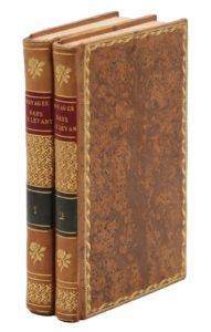 Paris, Delalain, 1769 ; 2 vol. in-12 (174 x 99 mm), basane racinée, dos lisses orné de résilles et roses dorées, guirlandes sur les plats (Reliures de l'époque). Première édition française.