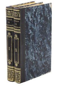 Paris, Fournier 1833 ; 2 vol. in-8 (207 x 131 mm), demi-veau bleu nuit, dos lisses ornés de motifs et fleurons dorés, roulette à froid sur les plats (Reliures de l'époque). Grande carte de l'Inde repliée. Édition originale publiée par la famille de Jacquemont après sa mort à Bombay, en 1832.