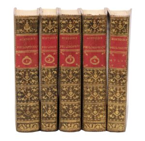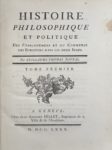 Genève, Pellet, 1780 ; 5 vol. in-4 (252 x 195 mm) dont un atlas, veau vert marbré, dos lisses ornés de fleurons dorés, filets sur les plats (Reliures de l'époque). Histoire des colonies et du commerce international mais, avant tout, virulente dénonciation du colonialisme, de l'esclavage et du despotisme sous toutes ses formes.
