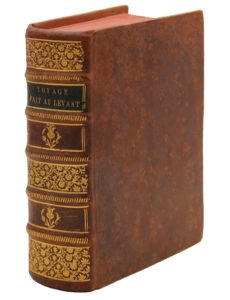 Paris, Thomas Jolly, 1664. – Suite du Voyage de Levant ... (où) il est traité de la Perse et aussi des antichités de Tchehelminar et autres lieux vers l'ancienne Persepolis. – Suite du voyage de Levant Seconde partie. Paris, Angot, 1674. – Voyages de M. Thevenot contenant la relation de l'Indostan, des nouveaux mongols et des autres peuples et pays des Indes. Paris, Vve Biestkins, 1684 ; 3 ouvrages en un vol. in-4 (220 x 166 mm) basane racinée, dos à nerfs orné de motifs et fleurons dorés (Rel. v. 1800). RARE RÉUNION DES TROIS VOYAGES DE THÉVENOT EN ÉDITIONS ORIGINALES.
