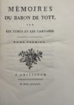 ÉDITION ORIGINALE. Tott était probablement le meilleur connaisseur de la Turquie de son temps. Diplomate à l'ambassade de France de Constantinople pendant de longues années, négociateur d'un traité de commerce avec le khan des Tartares, il fut ensuite consul en Crimée puis conseiller militaire de Mustapha III qu'il aida à réformer son armée et à repousser les Russes. Ses mémoires, extrêmement vivants, donnent un éclairage particulièrement intéressant sur l'état de l'Empire ottoman, les mœurs des Turcs et leur avenir dans un monde en mouvement.