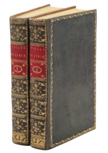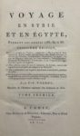 Paris, Dugour et Durand, an VII ; 2 vol. in-8 (198 x 125 mm), veau vert raciné, dos lisses ornés de fleurons dorés, pièces de titre et de tomaison en veau cerise, guirlande dorée sur les plats (Reliures de l'époque). 3 cartes et 4 planches repl. (le Sphynx, les Pyramides, vue et plan de Baalbek) sur 5.