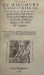 S.l. (La Rochelle, Pierre Haultin), 1587. – DISCOURS sur la Résolution de la Faculté de Théologie de Paris, faicte le septième Janvier mil cinq cens quatre vingt neuf. S.l.n.d. – LETTRE d'un gentilhomme catholique et vray françois. S.l. 1590. – LE MANIFESTE de la France, aux Parisiens et à tout le peuple françois. S.l., 1589. – DEVIS FAMILIER d'un gentilhomme catholique françois avec un laboureur sur la mort de Henry IIIe de ce nom, Roy de France et de Pologne, 1590 ; 5 ouvrages en un vol. in-8 (151 x 96 mm), veau moucheté, dos à nerfs orné d'un chiffre doré (Rel. début XVIIIe s.). ÉDITIONS ORIGINALES.