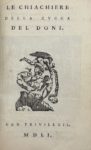 Venise, Francesco Marcolini, 1551 ; 3 parties en un vol. Suivi de Frutti della Zucca del Doni. Ibid., id., 1552. In-8 (161 x 104 mm), veau fauve, dos à nerfs orné, filets sur les plats (Rel. v. 1740). ÉDITIONS ORIGINALES. Propos facétieux, historiettes, balivernes et proverbes que Doni énumère dans une liste à la Rabelais : chimere, gosserie, argutie, fanfalucole, sentenze, ghiribizzi...