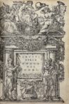 PREMIER TIRAGE DE L'EXUBÉRANT ENCADREMENT ARCHITECTURAL DU TITRE (répété pour les Frutti), spécialement dessiné pour cet ouvrage. Il dérive d'un modèle introduit en 1550 à Florence par l'imprimeur Lorenzo Torrentino. Vignette répétée sur les titres des 3 parties (la Vérité fille du Temps) et 25 bois, plusieurs à pleine page dont 2 portraits et la composition figurant Dante, Pétrarque et Boccace devisant, certains répétés ; plusieurs proviennent des Sorti publiés par Marcolini en 1540. Encadrement de titre, portrait de Pétrarque, grand encadrement et vignette pour les Frutti.