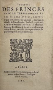 Paris, Nicolas Bonfons, 1580. In-8 (169 x 104 mm), vélin souple à recouvrements (Reliure de l'époque). À travers le portrait idéalisé de Marc-Aurèle, Guevara, prédicateur et historiographe de Charles Quint, trace le modèle du prince, empreint de stoïcisme et plein d'humanité. Les oeuvres de Guevara exercèrent une grande influence dans toute l'Europe humaniste du XVIe s.