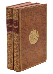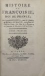 Paris, Belin, 1783 ; 2 vol. in-8 (195 x 123 mm), veau marbré, dos lisses ornés de fleurons dorés, filets sur les plats, armes au centre (Reliures de l'époque). Le court règne de François II, fils de Henri II et Catherine de Médicis, époux de Marie Stuart, marqué par les luttes de pouvoir entre les Guise, oncles de Marie Stuart, les Lorraine et les Protestants.