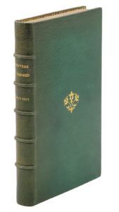 Paris, Étienne Groulleau, 1557. In-8, maroquin vert, fleuron doré au centre des plats, dos à nerfs, dentelle intérieure, tranches dorées sur marbrure, boîte moderne (Chambolle-Duru). Première traduction vernaculaire établie sur l’original grec du corpus hermétique.