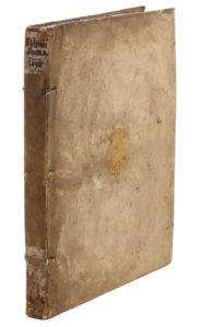 Milan, Ulrich Scinzenzeler, 1498. In-folio de [144] ff., vélin souple à recouvrements, armoiries dorées au centre des plats, dos lisse, nom de l'auteur manuscrit sur la tranche de queue (Reliure ancienne). Seconde édition des œuvres de Sidoine Apollinaire et la première accompagnée du commentaire de Giovan Battista Pio (1460-1543), poète et philologue de Bologne, disciple de Beroaldo.