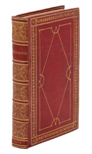 Venise, Officina Farrea [Giovanni Farri et ses frères], 1543. – Σχολια παλαια... Commentaria vetera in Theocriti Eglogas. Ibid., 1543. 2 parties en un volume in-8, maroquin rouge à long grain, bordure dorée en encadrement, encadrement losange-rectangle lobé dans les milieux, dos lisse orné à fond criblé, double filet intérieur, doublures et gardes de soie violette avec une roulette dorée encadrant les doublures, tranches dorées (rel. p. Bozerian jeune). Très jolie et rare édition en grec des Idylles de Théocrite, réunie au commentaire de l'humaniste grec Zacharie Kalliergis, qui forme la seconde partie du volume.