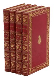 Londres [Paris] s.n. [Cazin], s.d. [1782]. 4 volumes in-18, maroquin rouge, bordure de petits fers dorés sertie de doubles filets, fleuron au centre, dos orné, dentelle intérieure, tranches dorées sur marbrure, étui collectif (Hardy). Première édition illustrée de ce célèbre roman libertin.