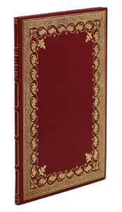 Paris, Blanchard, 1854. In-8, maroquin rouge, riche encadrement à fond criblé bordé d'une frise de rinceaux dorée, dos orné de filets dorés, doublures de maroquin vert encadrées d'un filet doré, gardes de soie brochée, doubles gardes, couverture, chemise et étui gainés du même maroquin (Noulhac, 1909). « Petit livre d'enfant très rare en belle condition » (Carteret).