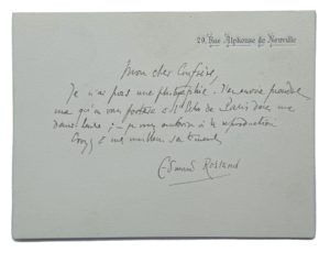 C.A.S. "Edmond Rostand". S.l.n.d. 1 page in-12 oblong à son adresse 29 rue Alphonse de Neuville à Paris.