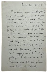 A propos du drame lyrique L'Attaque du Moulin, ouvrage d'Alfred Bruneau sur un livret de Zola. Il répond à une lettre ouverte du critique, publiée dans Le Journal du 28 novembre 1893, à la suite d'une "interview" que Zola aurait donnée dans L'Echo de Paris du 26 novembre, quelques jours après la première de l'ouvrage, le 23 novembre. "Je n'accepte jamais la responsabilité d'une interview. Mais c'est vrai, je me suis imaginé que vos plaisanteries contre la pièce, sinon contre la partition, étaients rendues plus amères par les mauvais souvenirs que vous avez gardés de l'Opéra Comique. Mettons que je me sois trompé, et surtout croyez-moi très sympathique à la cause de M. Chapuis qui est un jeune musicien de talent." (Il fait référence à l'insuccès d'Enguerrange, drame lyrique avec un livret de Victor Wilder d'après Bergerat sur une musique d'Auguste Chapuis, créée le 9 mai 1892 et qui n'eut que 3 représentations.)