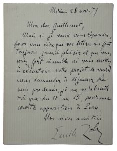 ZOLA (Émile)(1840-1902) — L.A.S. "Emile Zola" au peintre Antoine Guillemet. Médan, 28 novembre 1879. 1 page in-12.