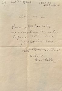 L.A.S. "Bourdelle". Étables, 29 septembre 1920. 1 pages in-8, pour le féliciter de sa Légion d'honneur.