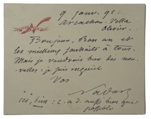 NADAR (1820-1910) — C.A.S. "Nadar". Arcachon, 9 janvier 1891. 1 page in-16 oblong gravée en rouge à sa devise Quand Même.