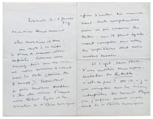Après avoir donné son accord à la soirée du 8 mars, il prie ...Madame Halphen d'être elle-même d'accord avec Robert Lyon et la direction de l'Opéra-Comique afin d'éviter dès maintenant toute complication... pour arrêter les dates des concerts et répétitions. ...Il s'agit, sans doute, dune audition sans représentation du Retable [le « Retable de Maître Pierre », opéra] n'est-ce pas ? Or il n'y a que compter sur les mêmes interprètes du Concert Pleyel, que j'espère seront ceux aussi de l'Opéra-Comique (Dufranne et Salignac). Quant au rôle de l'enfant, j'ignore encore si (sil) sera chanté par Vera ( ?). Je le souhaite... Pour le plan du programme, il s'incline devant les désirs de Mme Halphen, et espère ...que le projet dont Monsieur Christian Zevors [sic pour Zervos] m'a parlé (concernant la jeune musique espagnole) sera honorablement ( ?) réalisée... Pianiste et violoniste, ami d'Igor Stravinsky, Henri Monnet était membre du Conseil d'administration de la Salle Pleyel. Il fut l'un des fondateurs, avec Robert Lyon et Paul Robert, de l'Orchestre symphonique de Paris. L'épouse du compositeur Fernand Halphen tenait dans son hôtel particulier de la rue Dumont-d'Urville un salon de musique très courtisé.