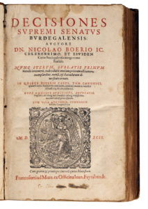 BOHIER (Nicolas). — Decisiones supremi senatus Burdegalensis […]. — Francfort, Feyerabendt, 1599. — In-folio, peau daim, fleuron estampé au centre des plats (reliure de l'époque).