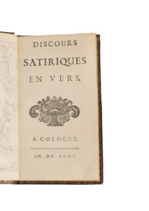 GACON (François)]. — Discours satiriques en vers. — A Cologne, 1696. — In-12, chagrin bordeaux janséniste, dos à nerfs, tranches dorées (reliure fin XIXe s.).
