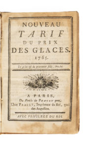 [GLACE]. — Nouveau tarif du prix des glaces. — A Paris, Chez Prault, 1765. — In-12°, basane marbrée, dos lisse (reliure de l'époque).