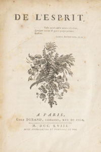 [HELVETIUS]. — De l'Esprit. — A Paris, Chez Durand, libraire, 1758. — In-4°, veau, dos à nerfs orné, pièce de titre de maroquin (reliure de l'époque).